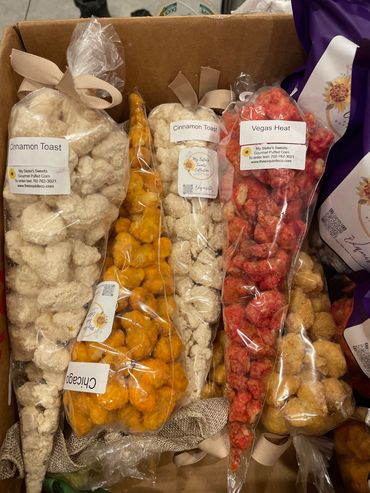 Our one-of-a-kind Gourmet Puffed Corn is likened to popcorn except it has no kernels or hulls. It is light and airy, meticulously handcrafted with love and attention to detail, ensuring a truly exceptional snacking experience. The perfect blend of sweet and savory, each fluffy kernel is generously coated with the toping of your choice creating a heavenly combination that will leave you wanting more. Pricing is for sizes Medium, Large & XL. Small available in quantities of 10 or more. Call or tex